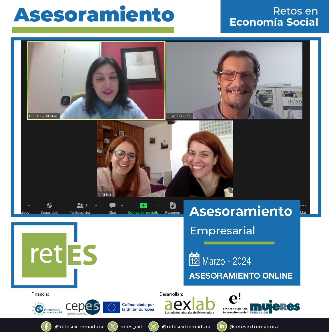 Ayer dentro del Proyecto Retes «Retos en Economía Social», realizamos un asesoramiento en formato online a dos emprendedoras que nos contaron su caso y a las cuales les explicamos como podrían seguir con su idea emprendedora basada en la #EconomiaSocial.