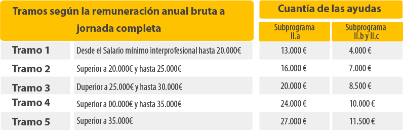 - Para este programa se establecen unas cuantías para contrataciones indefinidas a tiempo completo en función de la remuneración anual bruta,